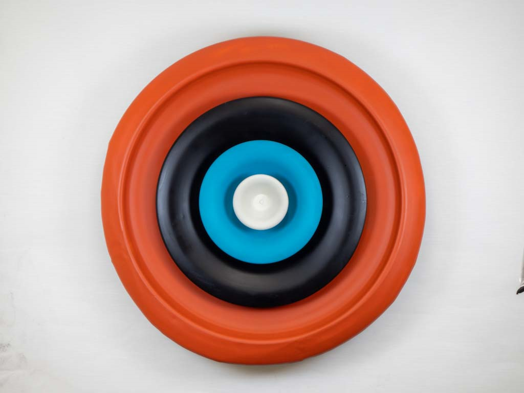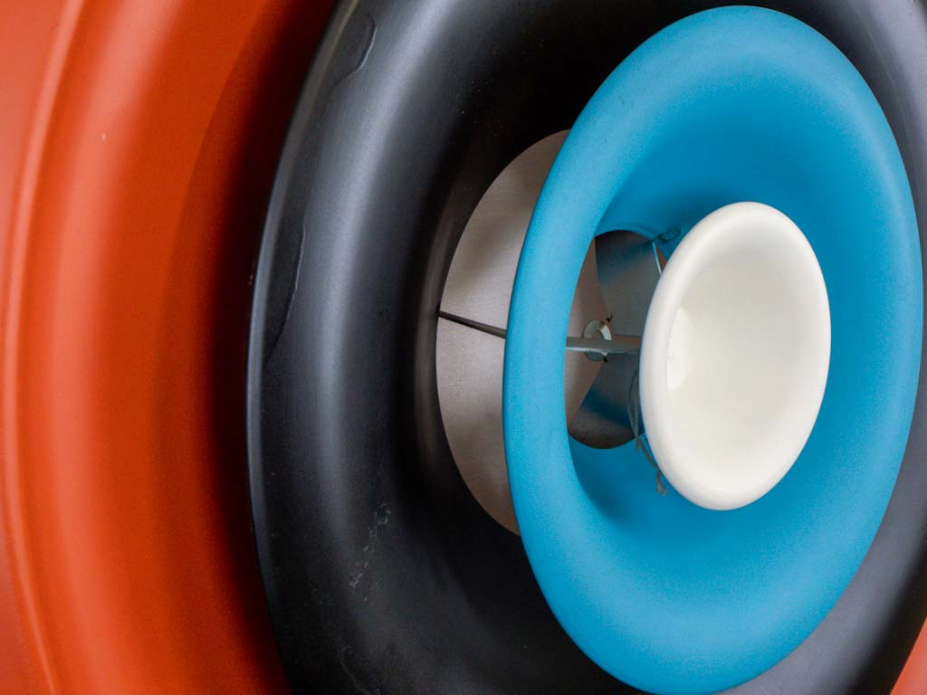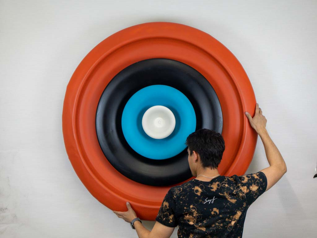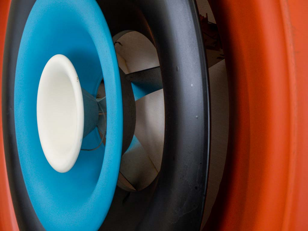 A circular marvel, crafted from a vintage air vent and adorned with radiant colors, embodying both sustainability and industrial aesthetics, seamlessly merging form and function to create a captivating symbol of Sustainable Industrial Art
