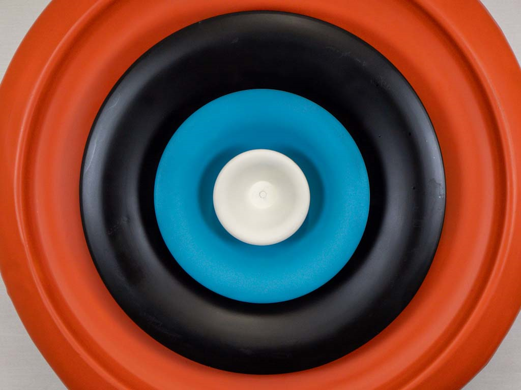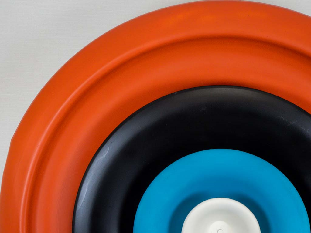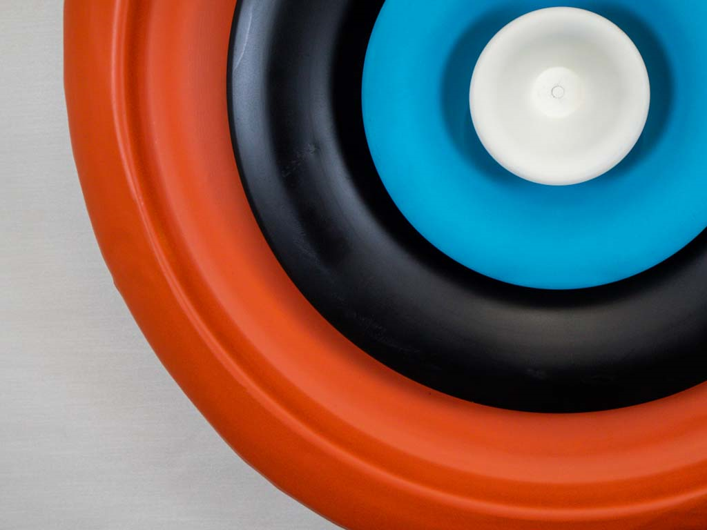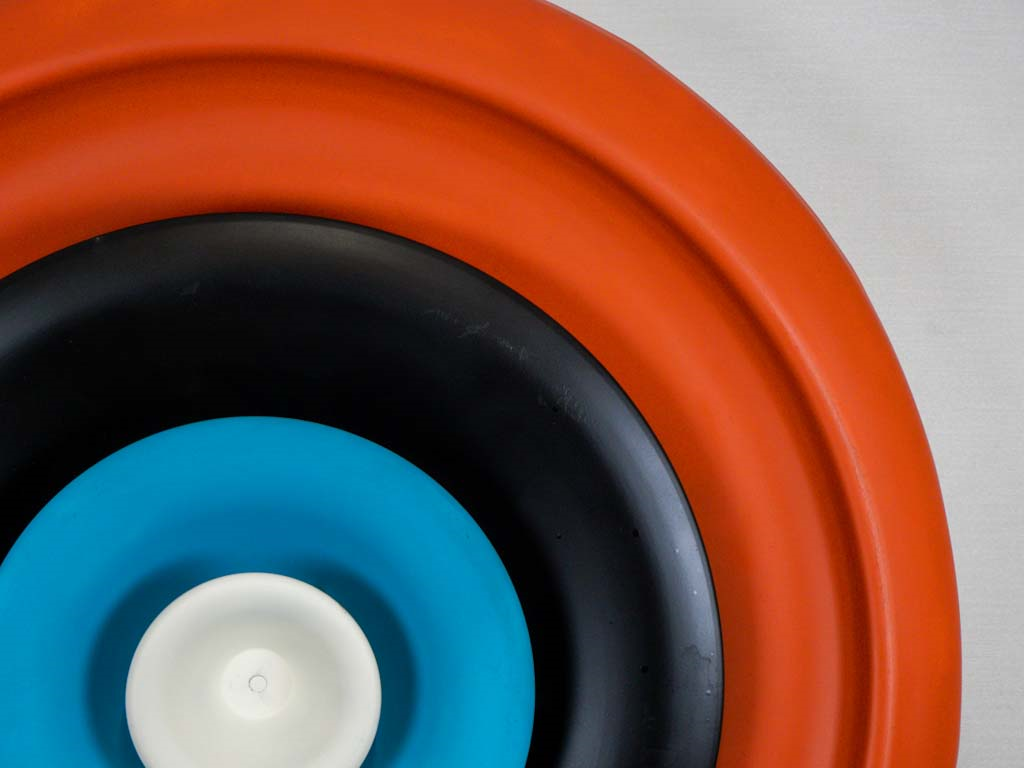 A circular marvel, crafted from a vintage air vent and adorned with radiant colors, embodying both sustainability and industrial aesthetics, seamlessly merging form and function to create a captivating symbol of Sustainable Industrial Art
