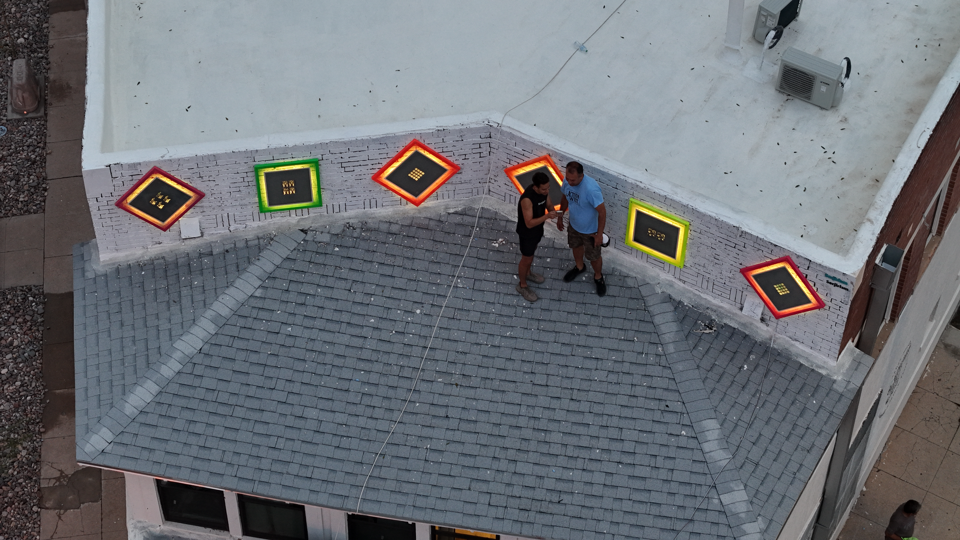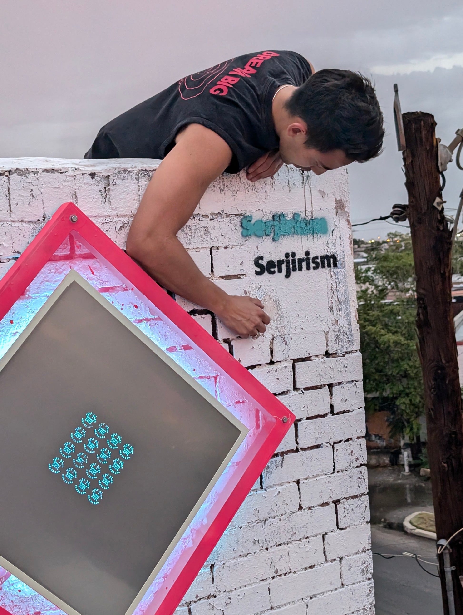 Serjirism is redefining public art with innovative lighting murals created using SMT-technology stencils that mount onto walls in geometric configurations of squares and diamonds. These illuminated compositions come alive at night, transforming urban spaces with a modern, elegant, and sophisticated glow. Blending industrial precision with artistic vision, these murals introduce a fresh visual language to the city—one that elevates architecture, enhances public environments, and brings a vibrant new identity to the streets after dark.